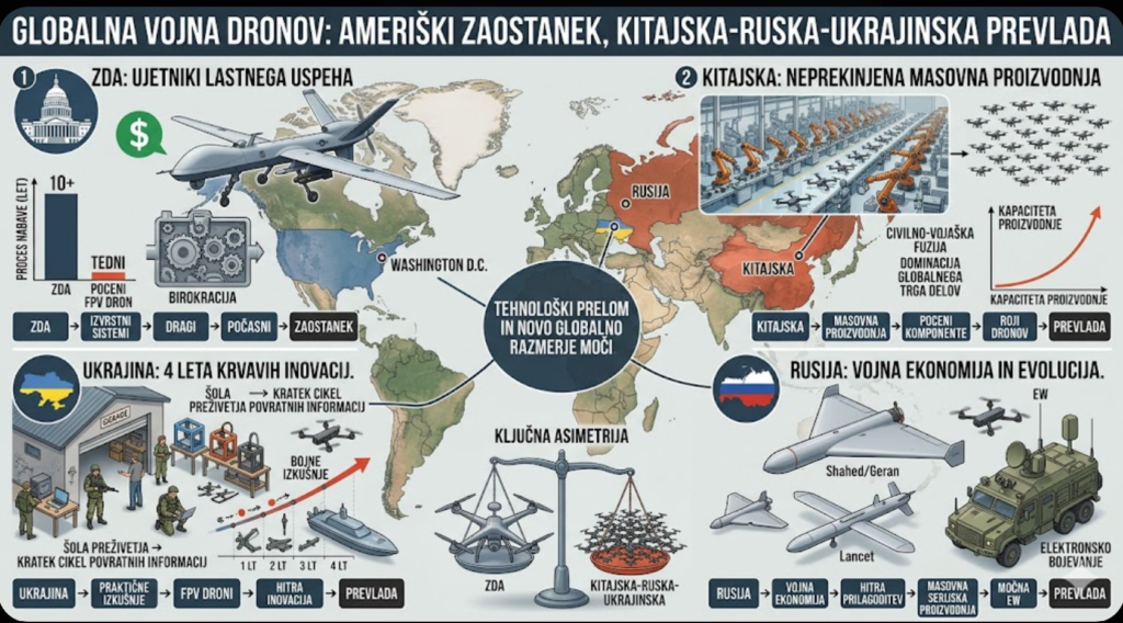Peking je koncept “civilno-vojaške fuzije” izpopolnil do skrajnosti. Nabor njihovih sposobnosti sega od masovne izdelave najmanjših komponent do razvoja avtonomnih rojev (swarms) dronov, ki komunicirajo z umetno inteligenco in delujejo kot enotna entiteta. Kitajska lahko v nekaj mesecih proizvede toliko dronov, kot jih preostanek sveta ne zmore v več letih. Ta proizvodna asimetrija je za zahodne stratege morda najbolj zastrašujoče dejstvo sodobne geopolitike.